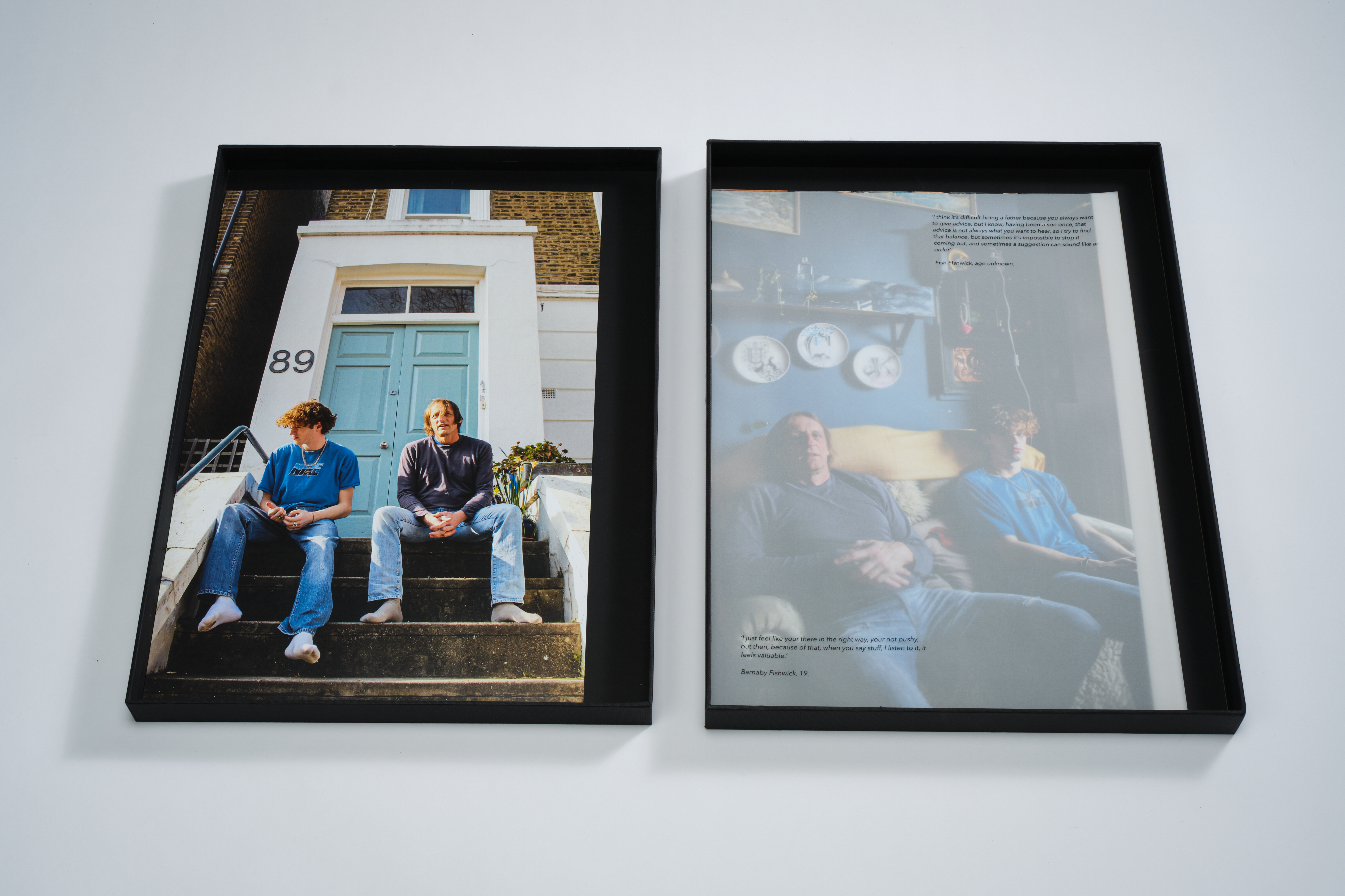 To display these 4 pairs of fathers and sons that I have shared, I have used A3 colour prints that intimately highlight my subjects, concealed within an archival box, for the viewer to hold and open. Furthermore, I have selected 4 quotes from each interview that resonated with me, and printed them on tracing paper to represent the delicate nature of the topic.